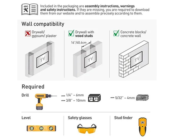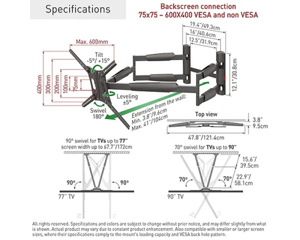 - VESA 100mm x 100mm, VESA 200mm x 200mm, VESA 75mm x 75mm, VESA 400mm x 400mm, VESA 600mm x 400mm, VESA 400mm x 200mm, VESA 300mm x 300mm, VESA 200mm x 100mm, VESA 400mm x 300mm, VESA 100mm x 200mm, VESA 300mm x 400mm